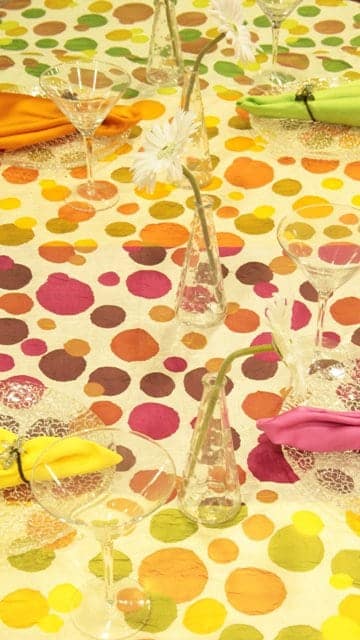 A long table with bands of color beneath make the topper transform. Fun with clear dinner and salad plates!